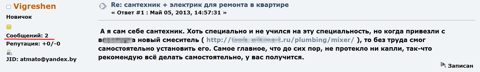 Впрочем, человек был занят - он про сантехнику спамил. В интересах одного небогатого, неразборчивого в связах и некомпетентного в рекламе магазина.
